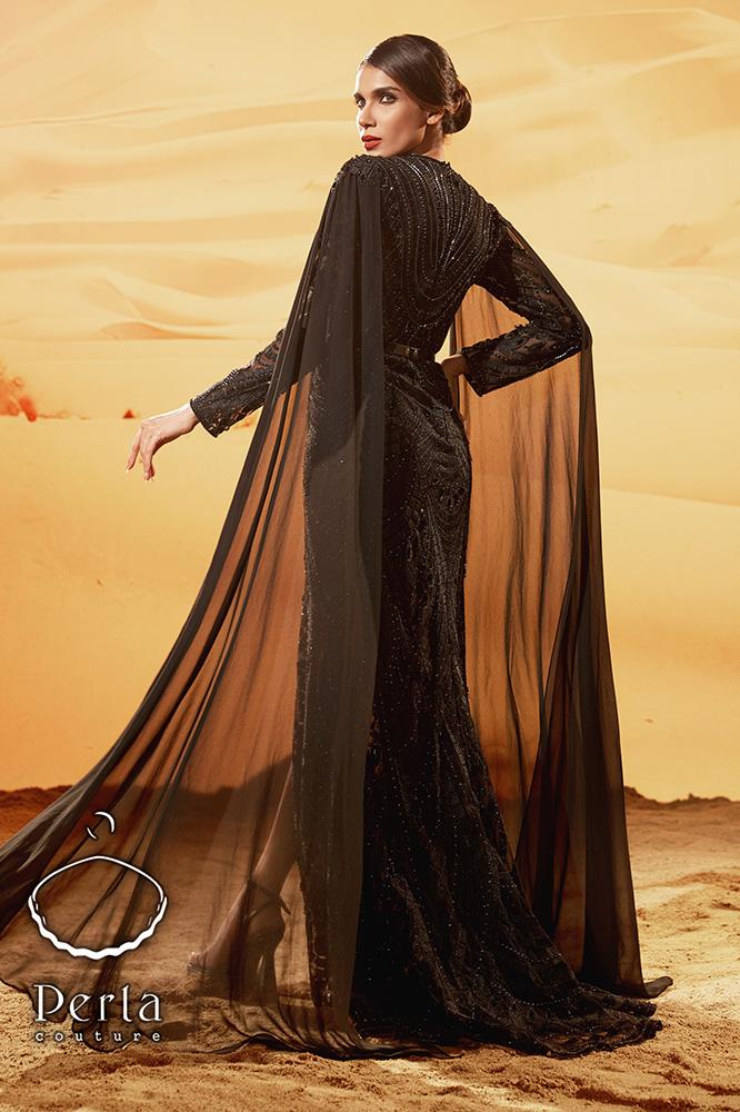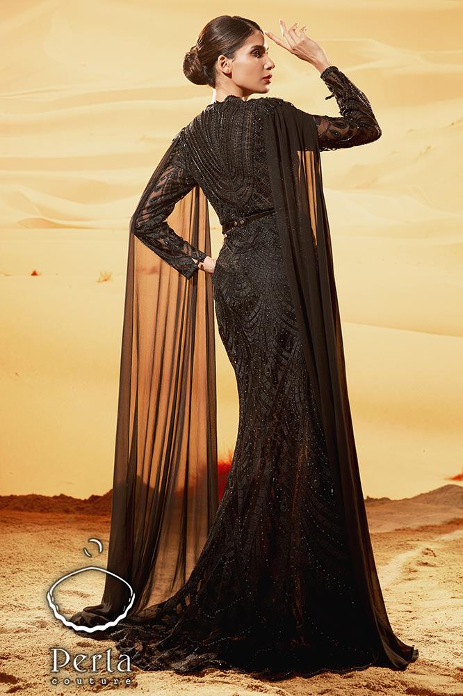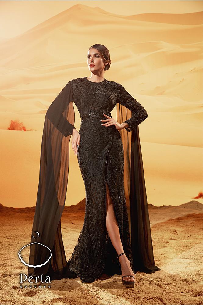 فستان أسود أنيق يتميز بتطريز فاخر من الكريستال ، أكمام شيفون واسعة، وشق جانبي أنيق و حزام جلد مميز يعكس الفخامة والرقي للمناسبات الراقية .