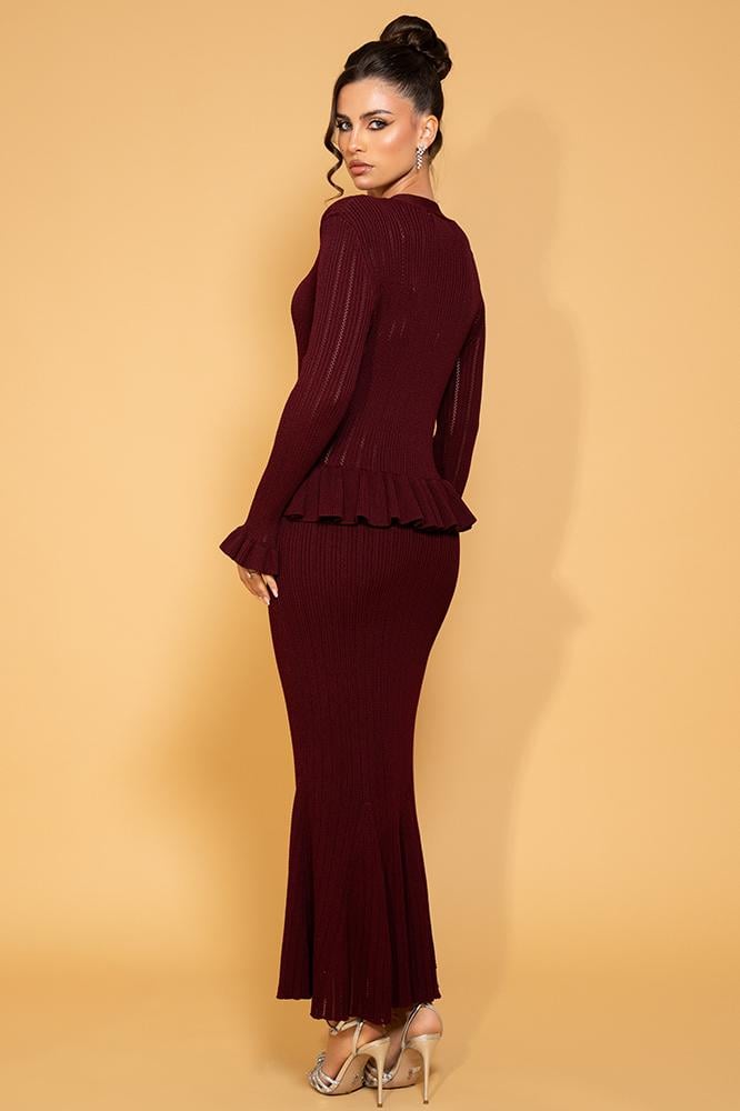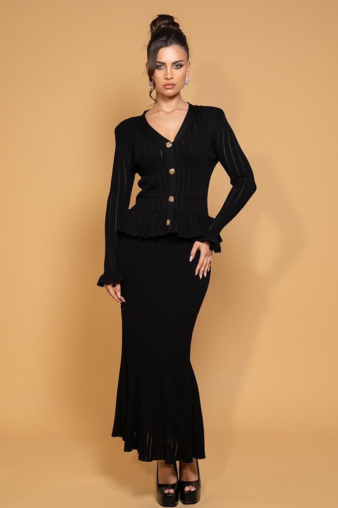 فستان بقصة ضيقة تبرز القوام مع أزرار ذهبية على الجزء الأمامي بياقة على شكل V وتفاصيل كسرات عند الخصر لإضفاء أنوثة