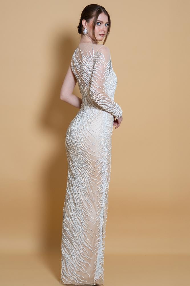 فستان بيج فاتح من التول بكم واحد طويل بينما الجهة الأخرى مكشوفة مزين بتطريزات براقة و كريستالات ، مما يمنحه لمسة فاخرة تناسب السهرات والمناسبات الراقية.