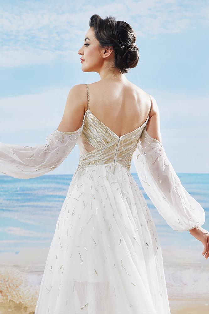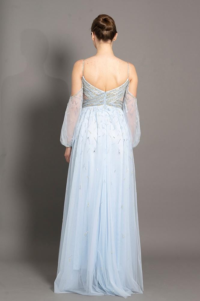 فستان تول بحمالات رفيعه و اكمام بف شك من عند الصدر والخصر مع بطانه داخليه قصيره
