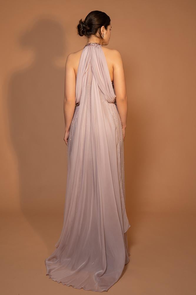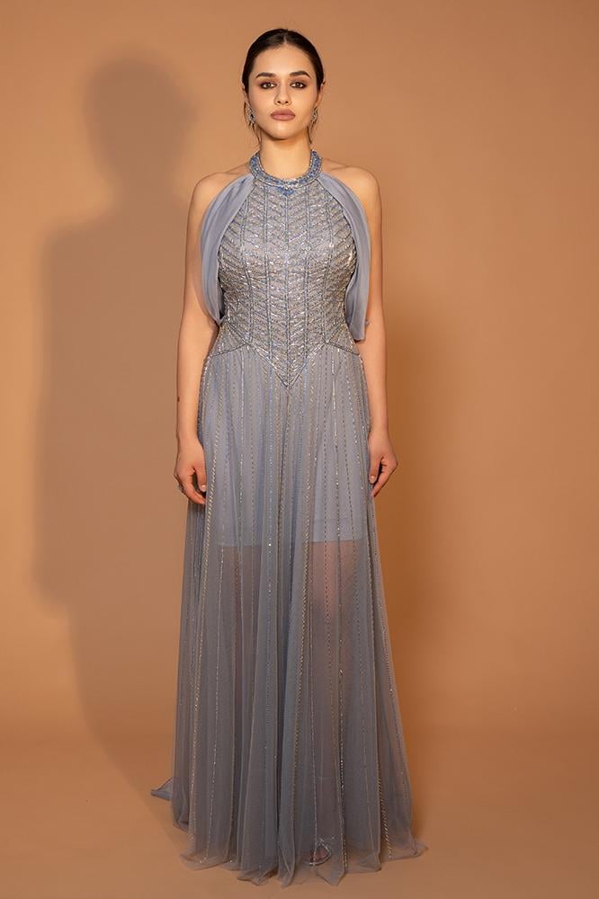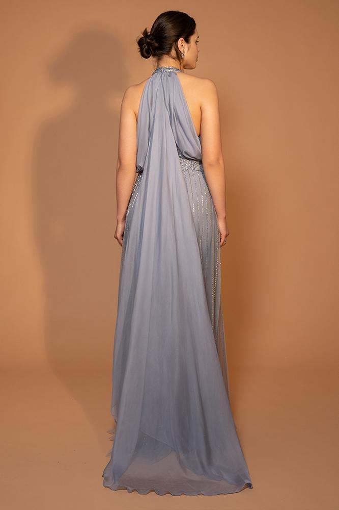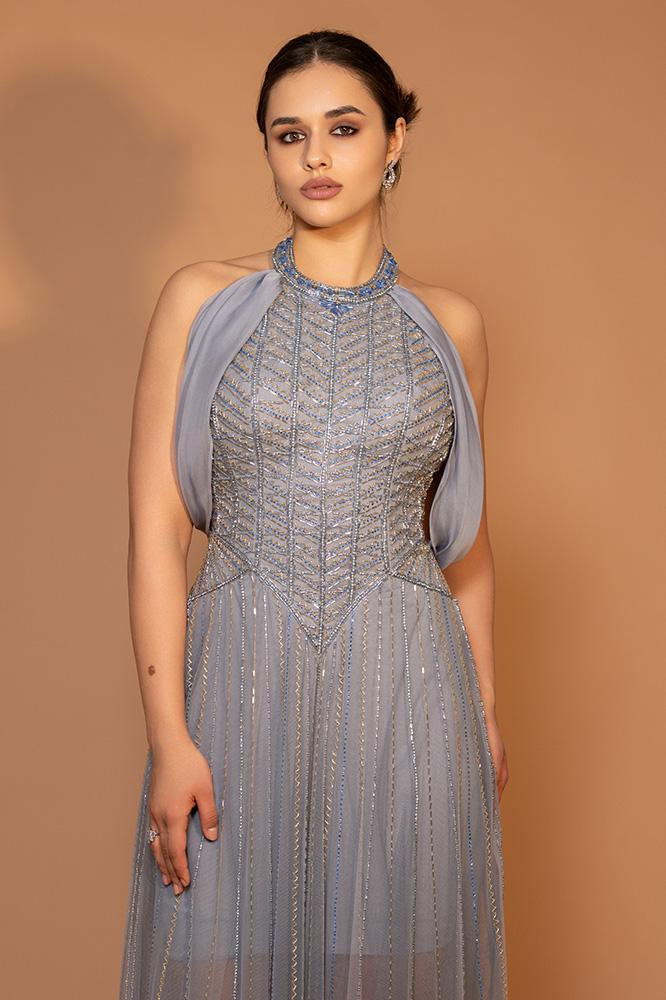 فستان سهرة أنيق بياقة هالتر مطرزة وكاب خلفي طويل