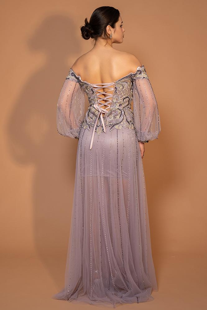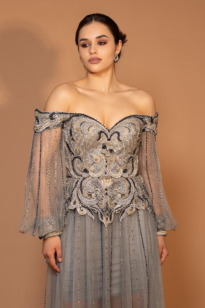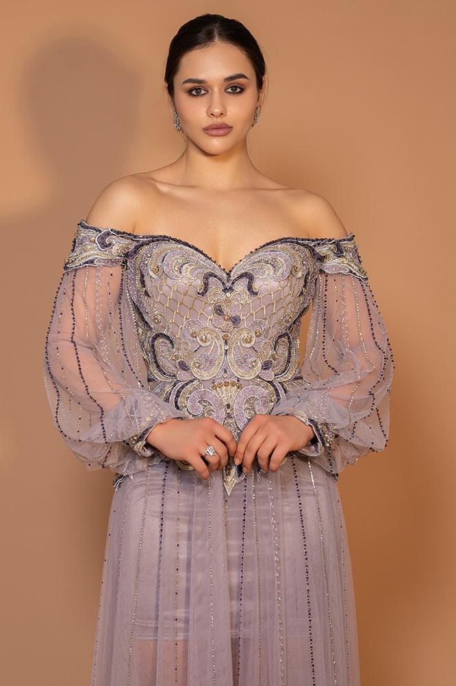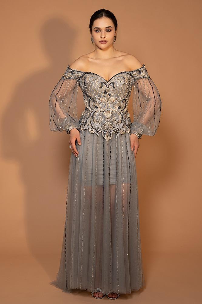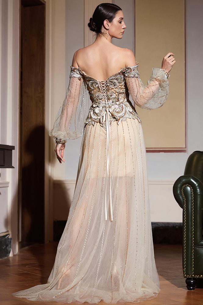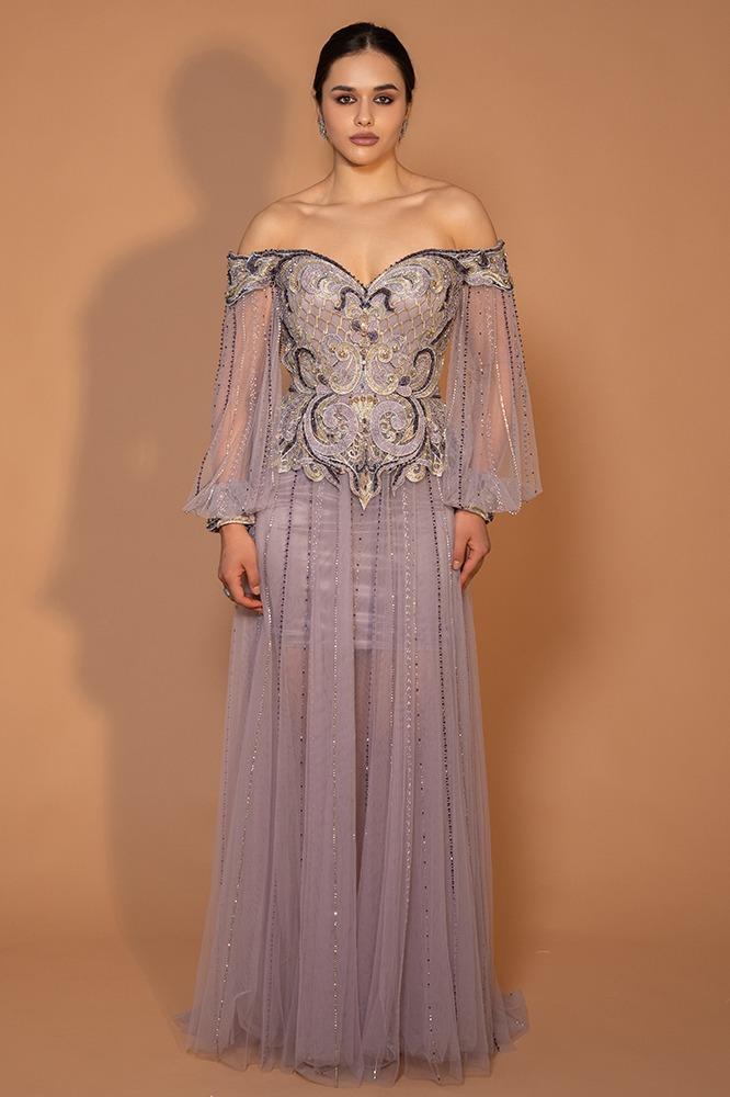 فستان سهرة تول أوف شولدرز مطرز بالكريستال بتصميم كورسيه فاخر