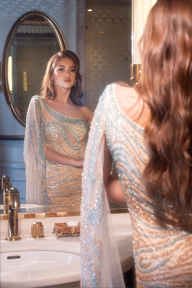 يتميز بقصّة ضيّقة تُبرز جمال القوام بانسيابية راقية، مع تطريز كامل بالكريستال اللامع الذي يمنح الفستان بريقًا فخمًا يعكس الفخامة في كل تفصيل. تنسدل من الكتف قطعة تول طويلة شفافة مطرزة تضيف حركة ساحرة ولمسة من الفخامة الملكية، ليكون الخيار المثالي للسهرات والمناسبات الراقية.