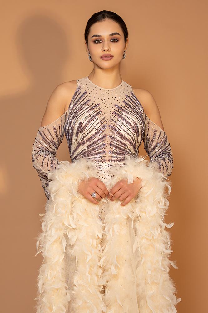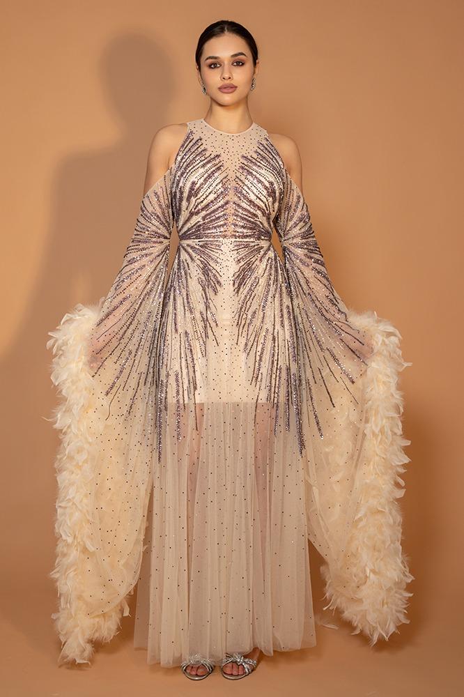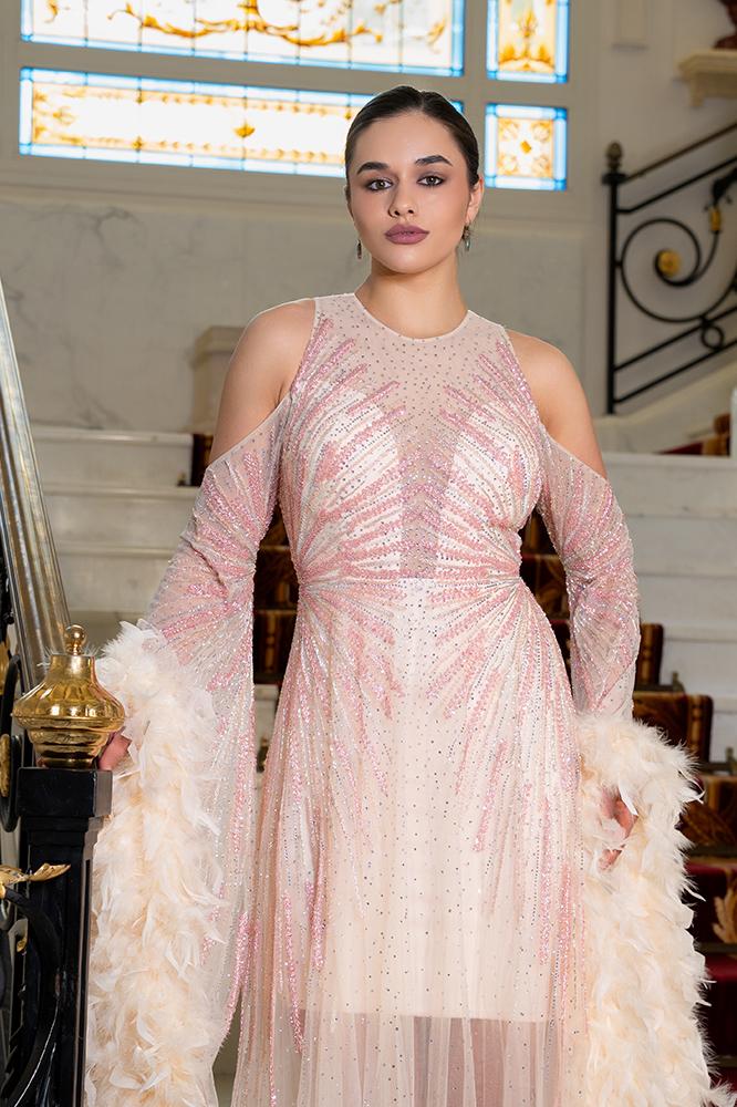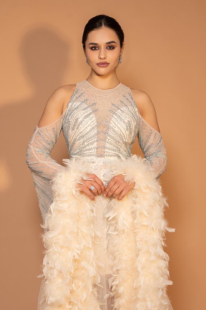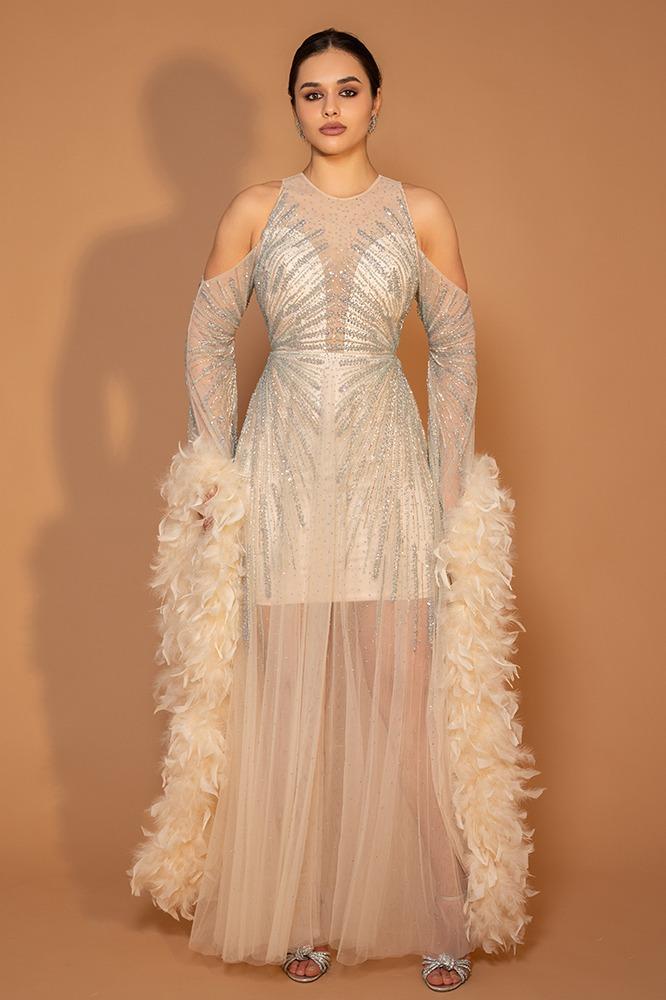 فستان سهرة تول فاخر مطرز بالكريستال والريش