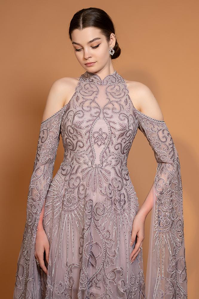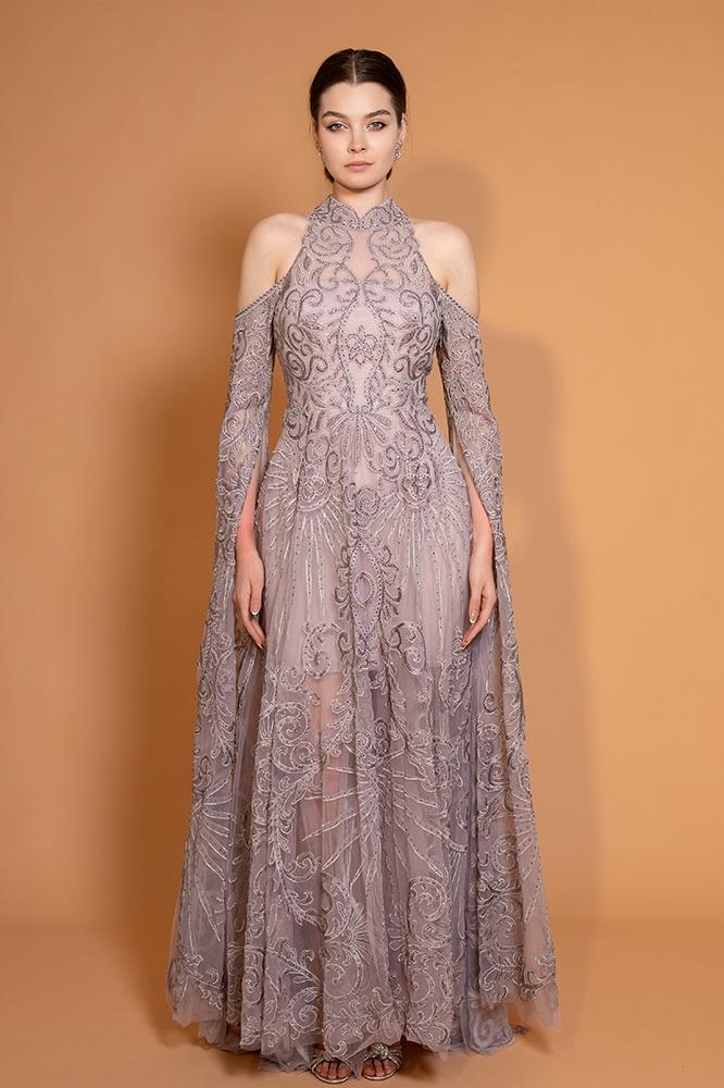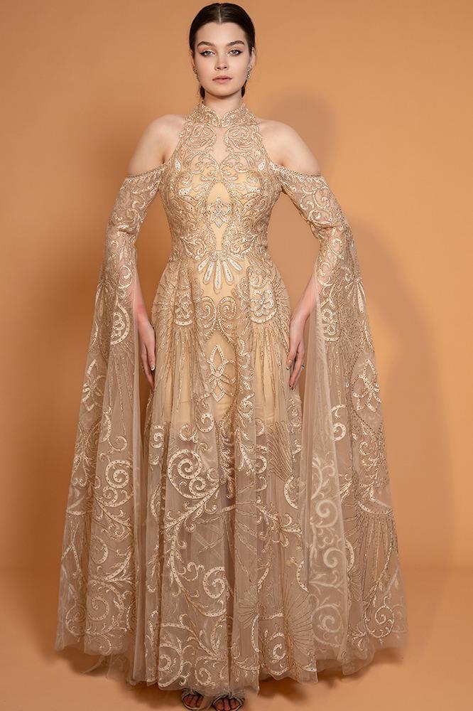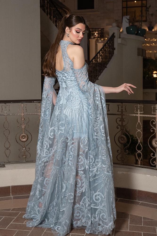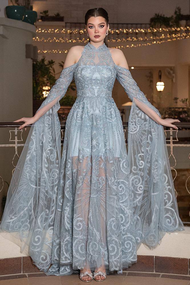 فستان سهرة تول مطرّز بالكامل مكشوف الأكتاف مع ياقة عالية مطرزة. بأكمام طويلة منسدله ، القصة ضيّقة من الأعلى وتتسع تدريجياً، مع بطانة داخليه قصيرة