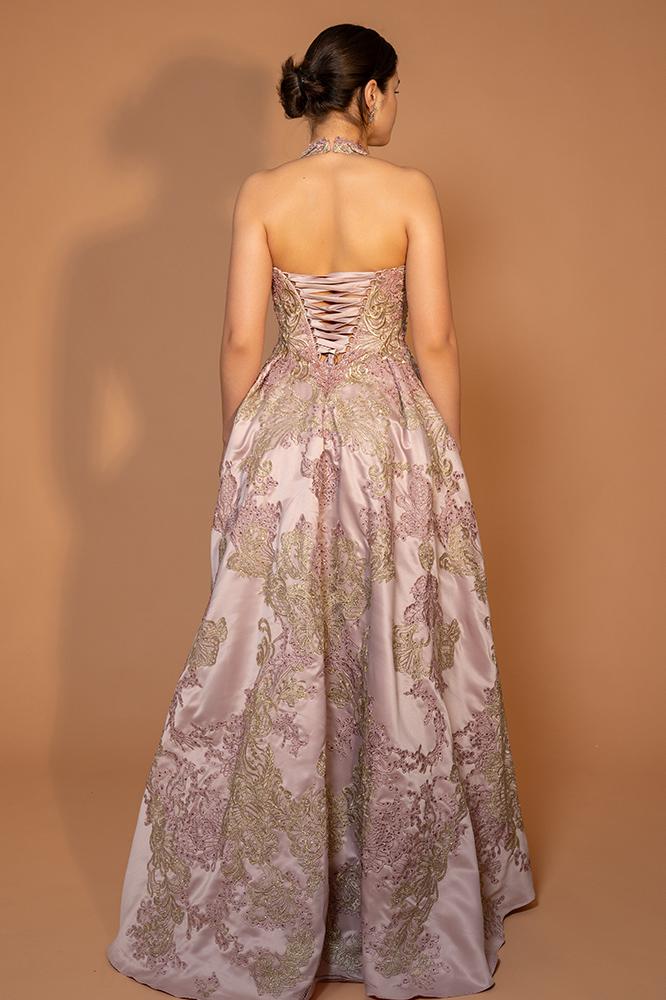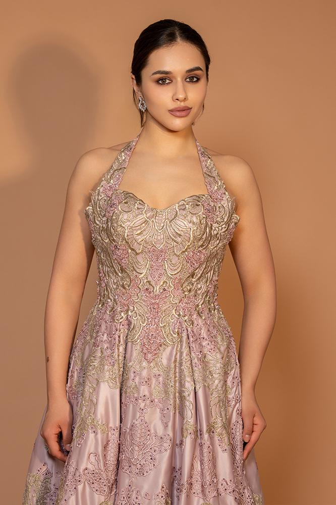يتميز الفستان بياقة هالتر مفتوحة من الأمام تضيف لمسة عصرية وجذابة، مع تفاصيل كورسيه خلفية برباط أنيق تعزز من تناسق القوام بأسلوب فاخر. كما يزدان الفستان بتطريزات فاخرة من الكريستال، الخرز، والترتر موزعة بدقة فنية تضيف له لمسة من البريق والفخامة.
