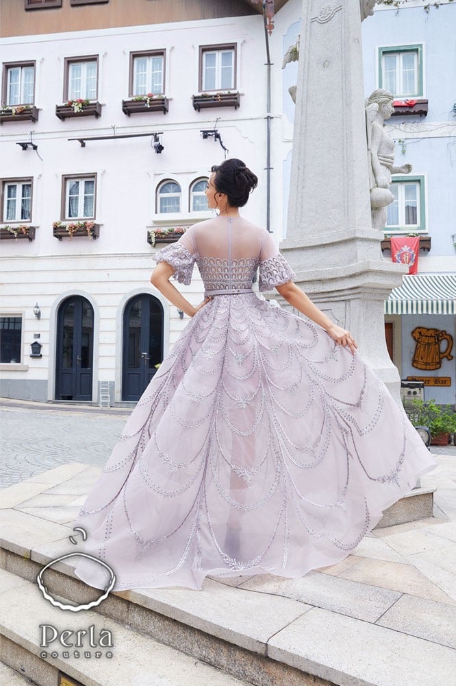 فستان سهره كلوش شك كامل ومطرز بالكريستال مع حزام جلد مزين بالكريستال و بطانه داخليه قصيره