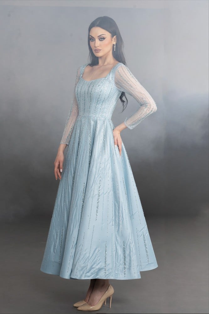 فستان سهرة تفتة ساتان مع تول ميدي اكمام طويلة شك بالكامل