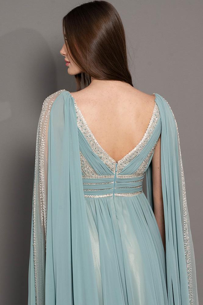 فستان سهره شيفون بقصه صدر v ، شك كامل بالكريستال بأكمام طويله منسدله .