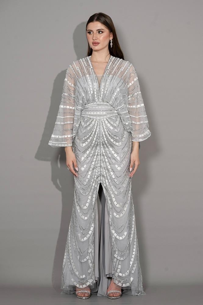 فستان سهره شيفون مطرز بأكمام طويله و عريضه مع فتحه اماميه و حزام مدمج عند الخصر .