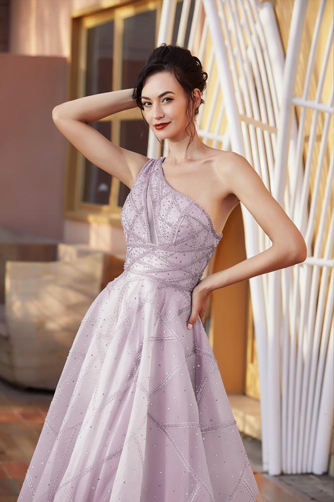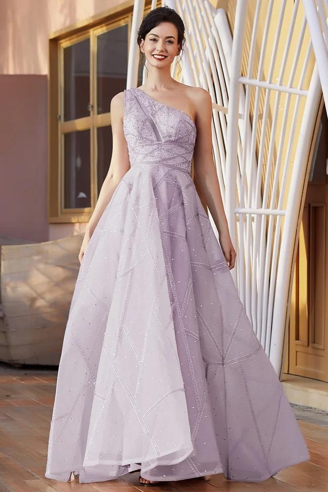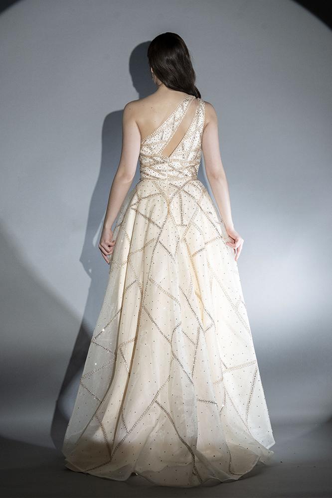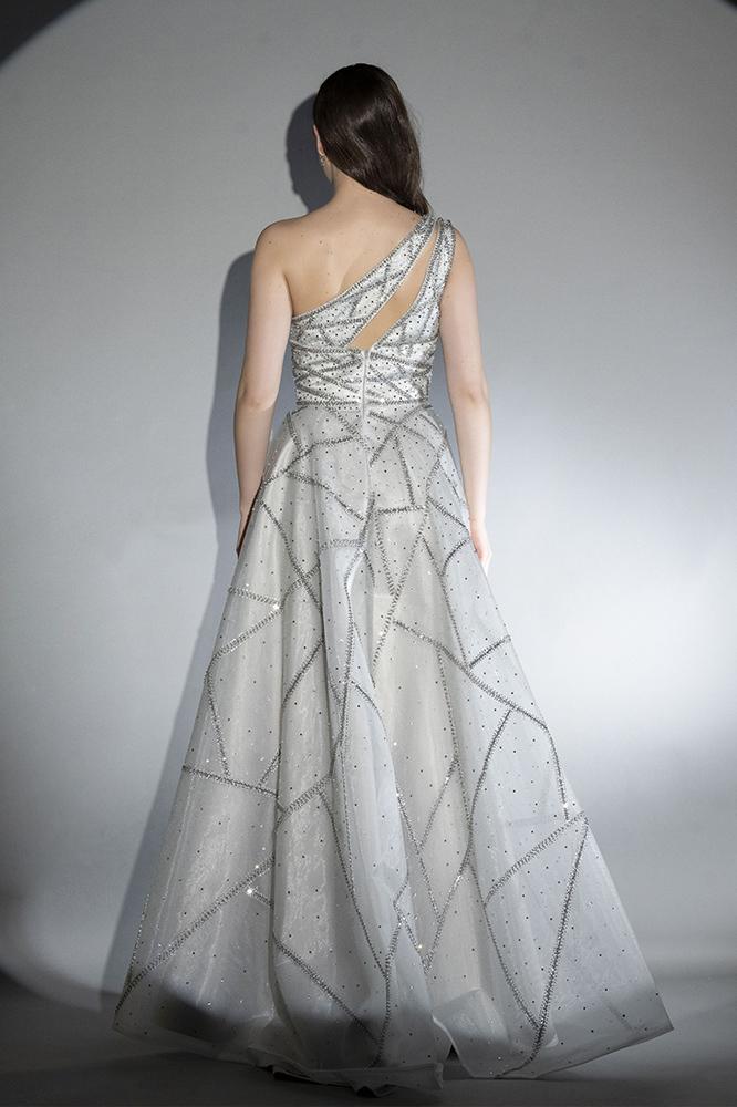 فستان سهره كلوش كتف واحد شك كامل مع فتحه من عند الظهر