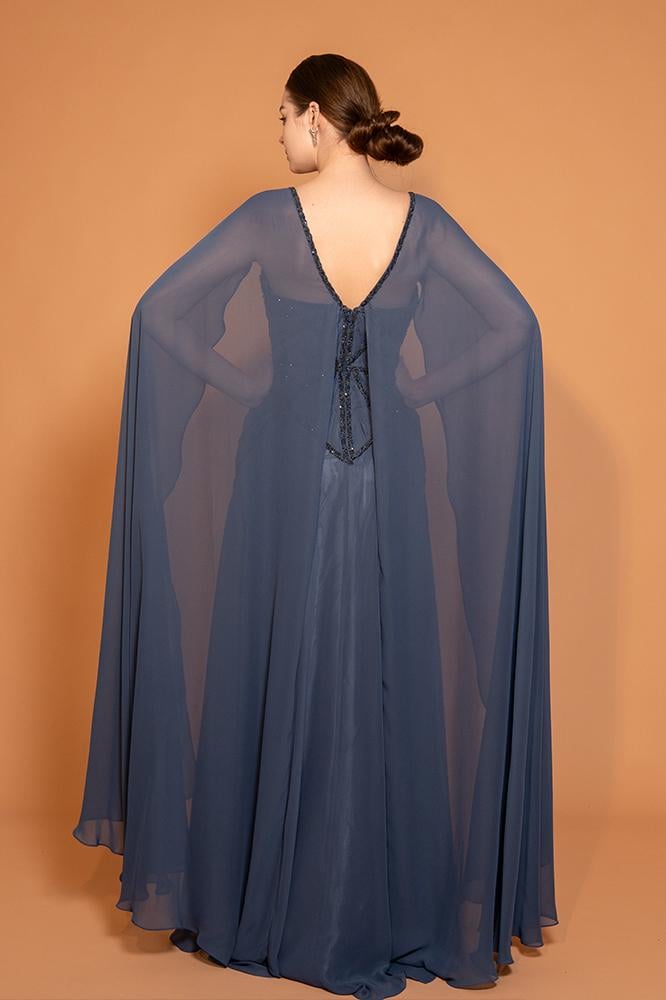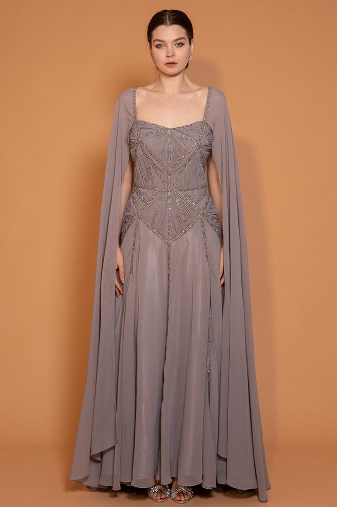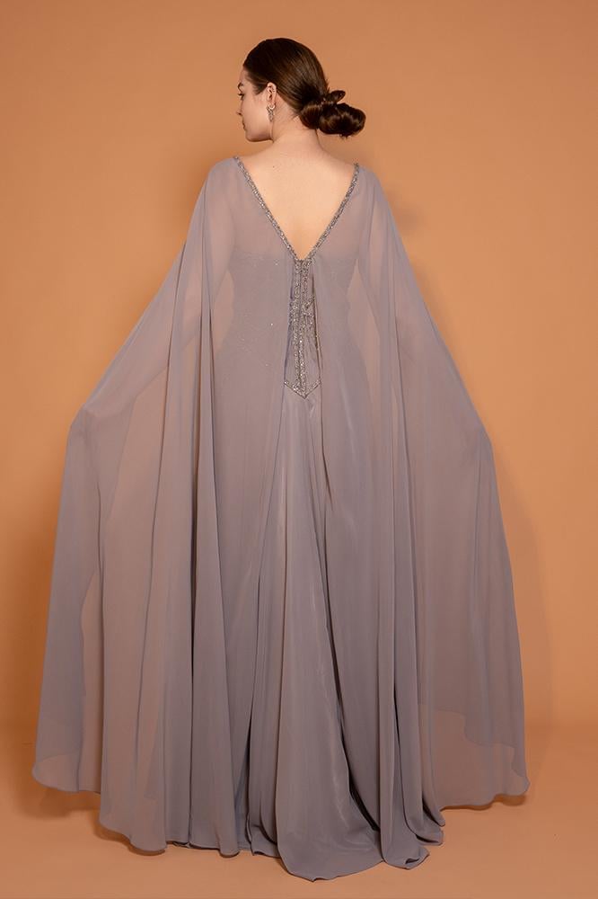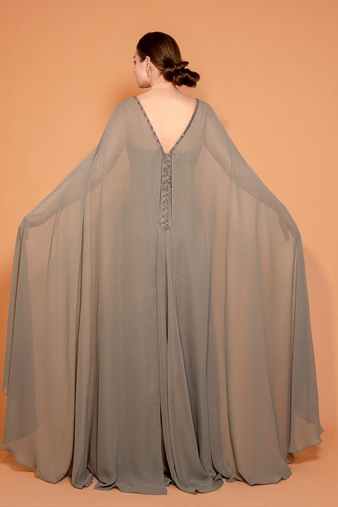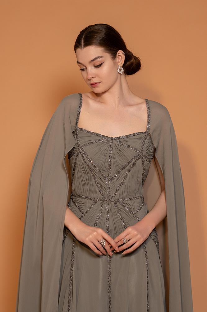 فستان شيفون بقصة فضفاضة مع تطريزات هندسية على منطقة الصدر والخصر لابراز شكل الجسم مع كاب طويل من الأكتاف وحتى الأرض ، الظهر مفتوح بشكل V ويكمّله تطريز ناعم.