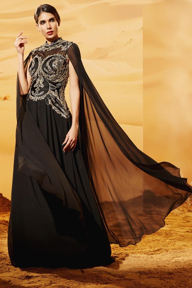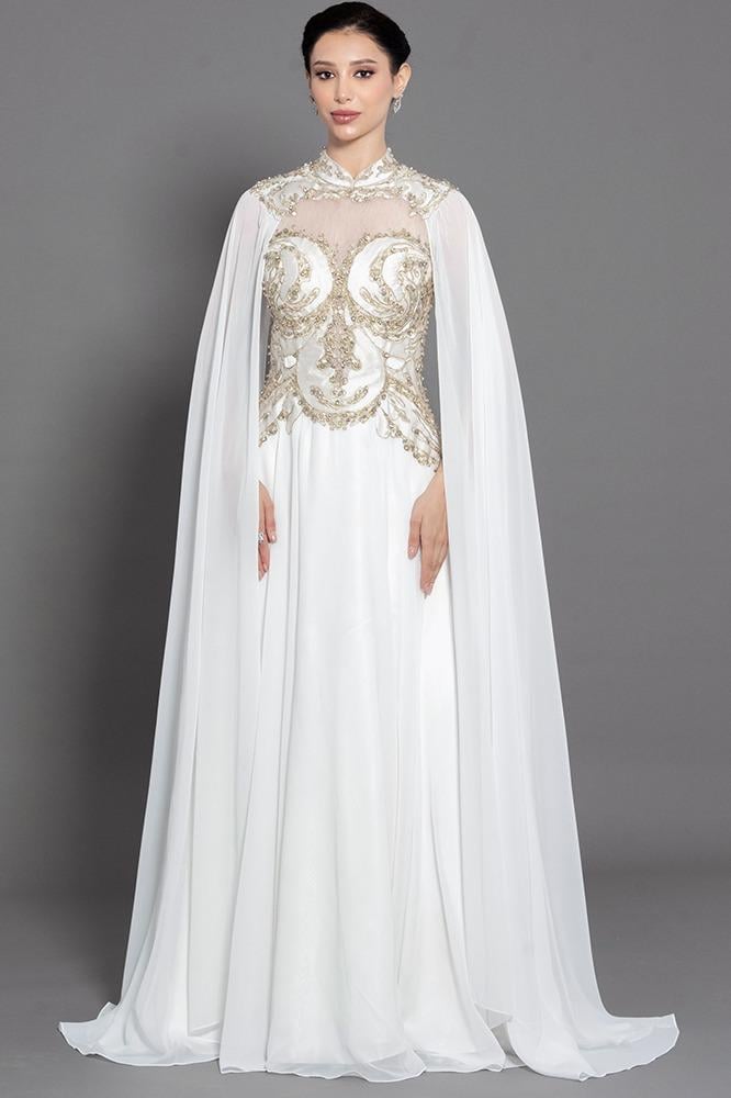 فستان شيفون هاي نك بأكمام طويله شك و تطريز من عند الرقبه ، الصدر والخصر