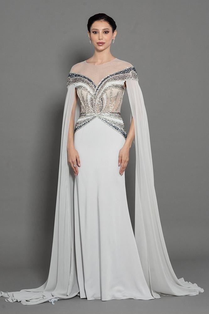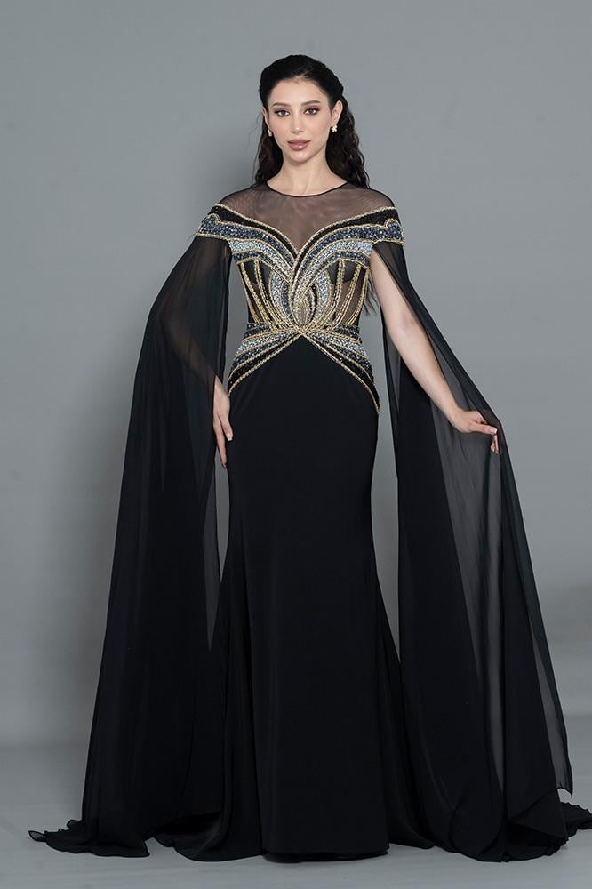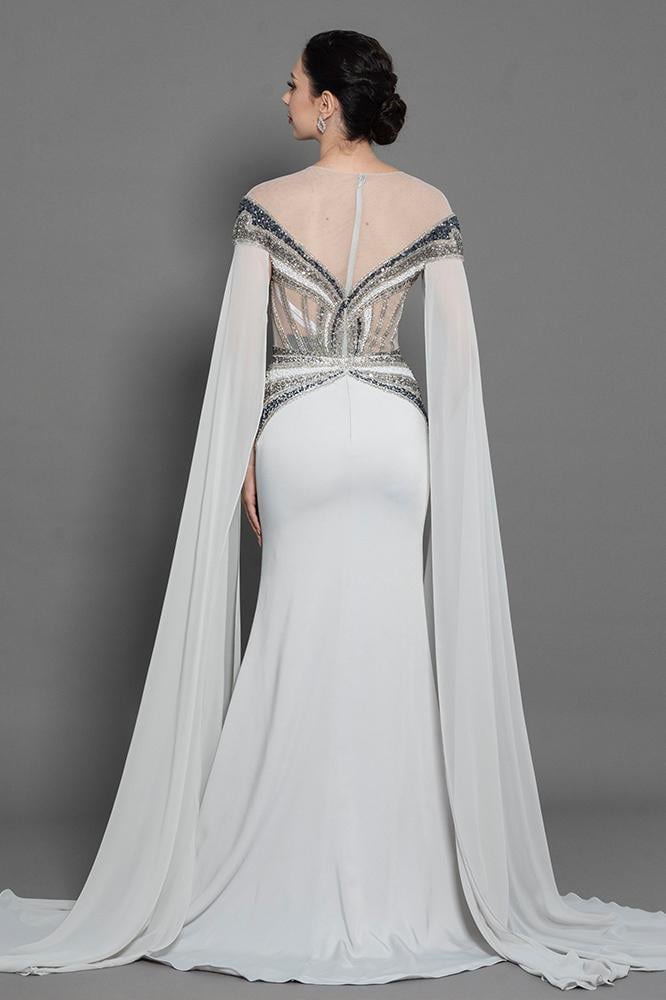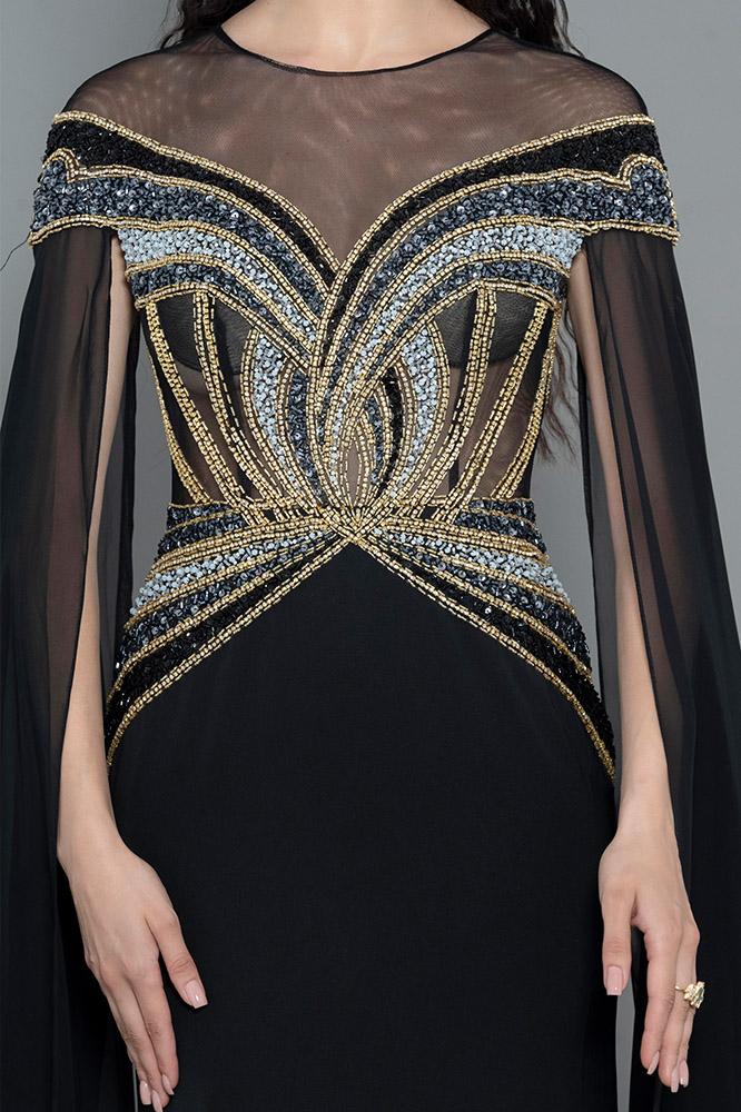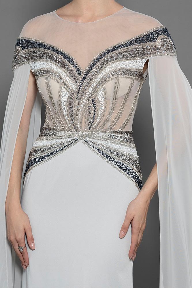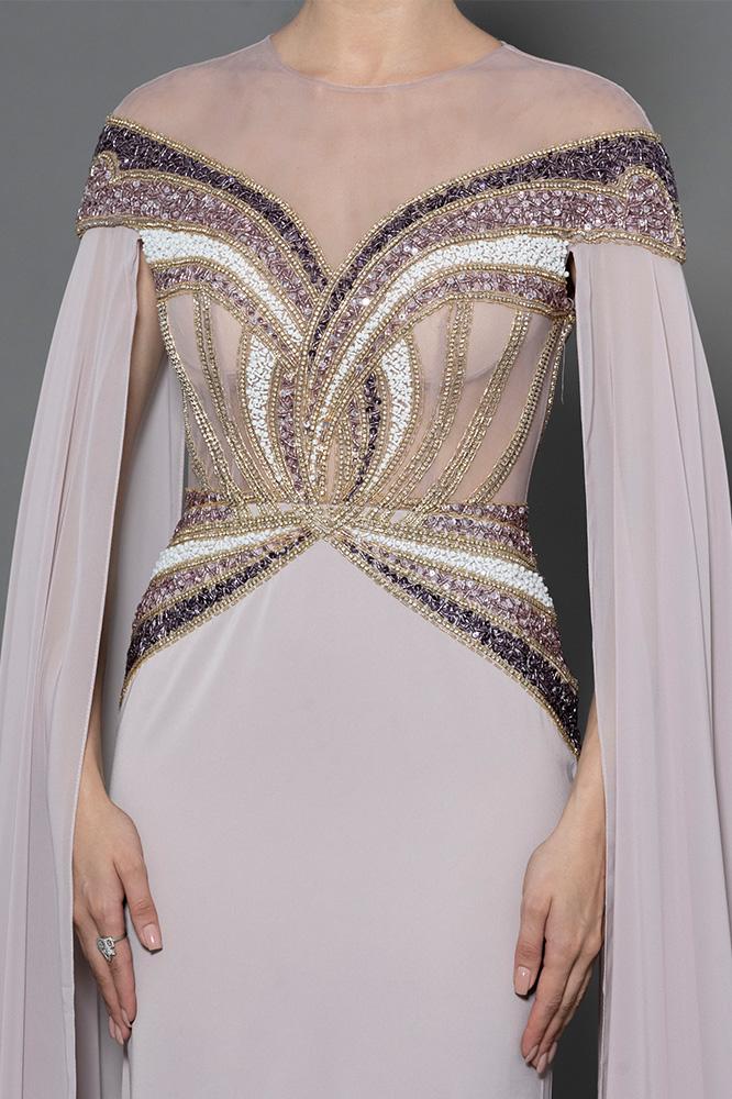 فستان شيفون بأكمام طويله مفتوحه شك كامل من عند الاكتاف ، الصدر و الخصر