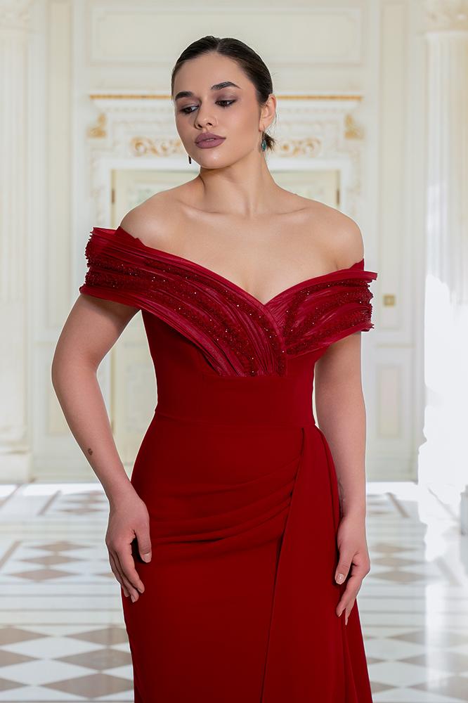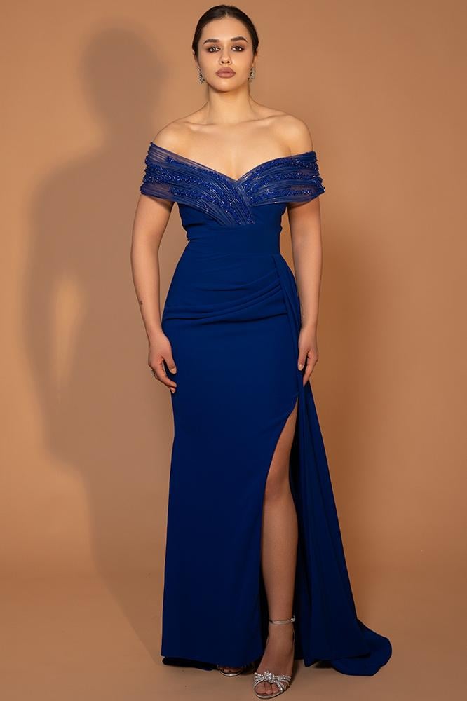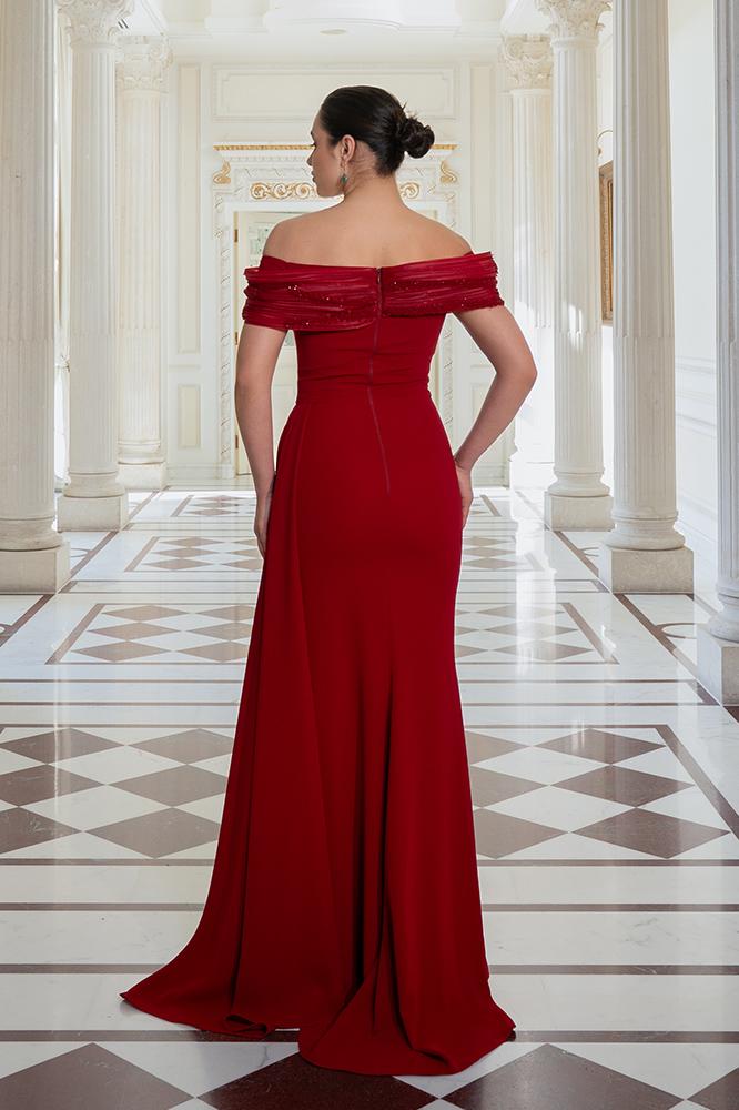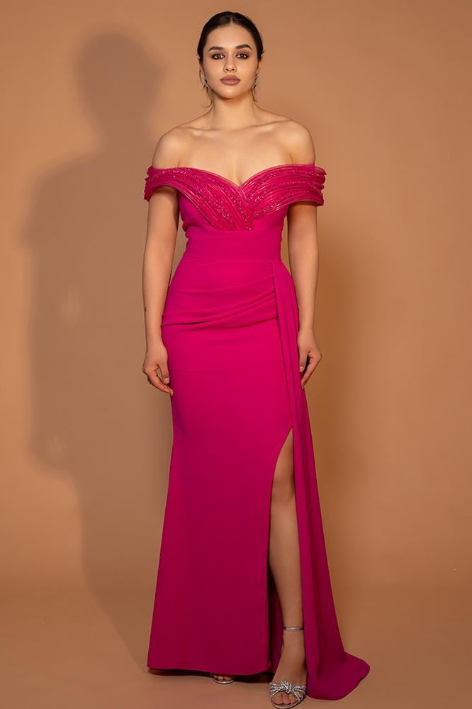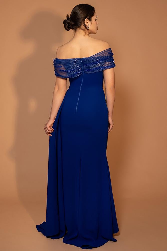 فستان كريب أوف شولدر مطرز بالكريستال وذيل جانبي أنيق