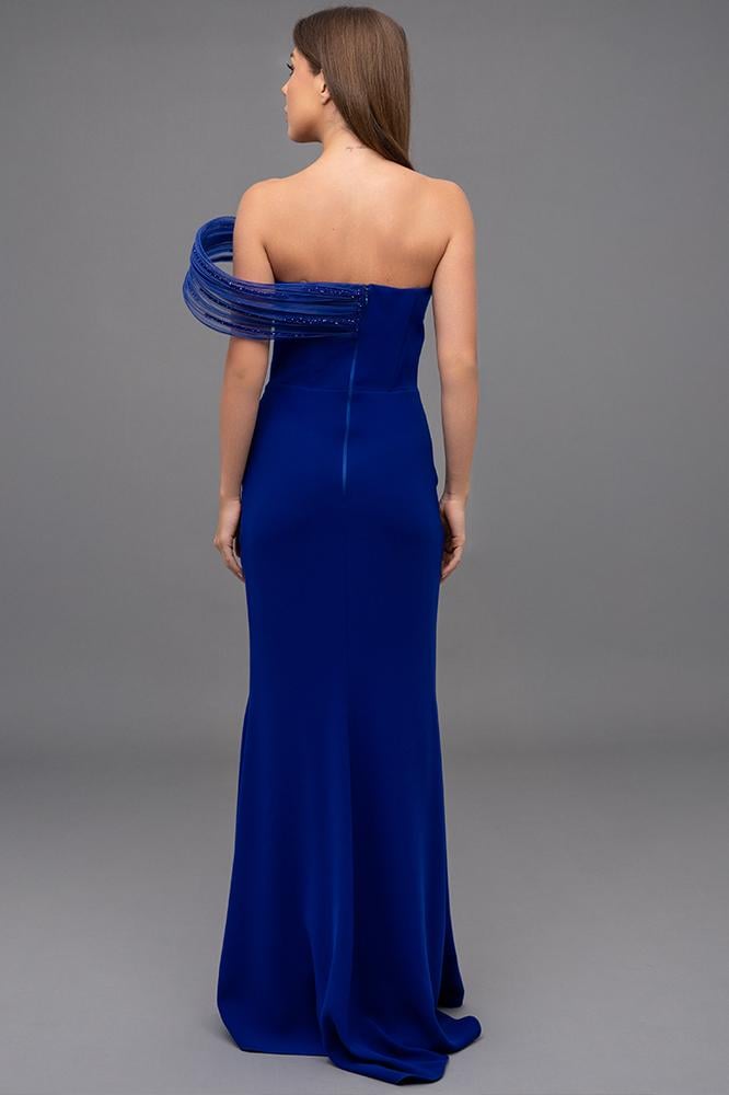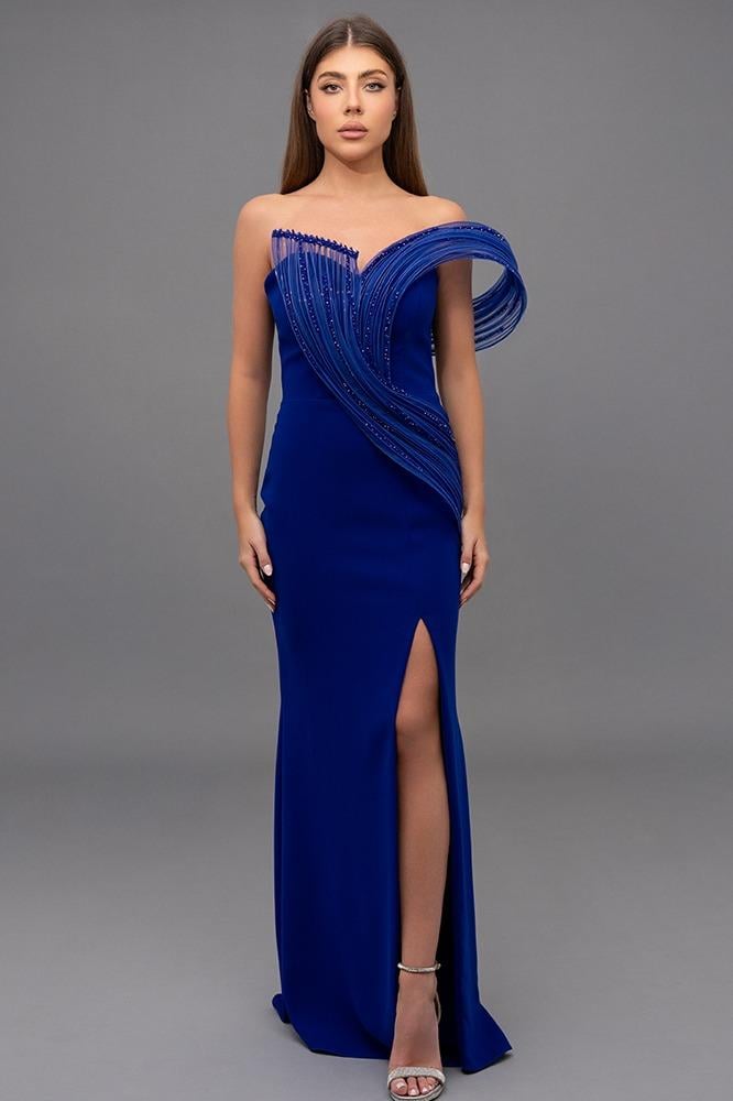 فستان كريب ضيق يبرز القوام، مع شق جانبي طويل لإطلالة أنثوية الجزء العلوي مزين بتفاصيل بارزة من خامة لامعة