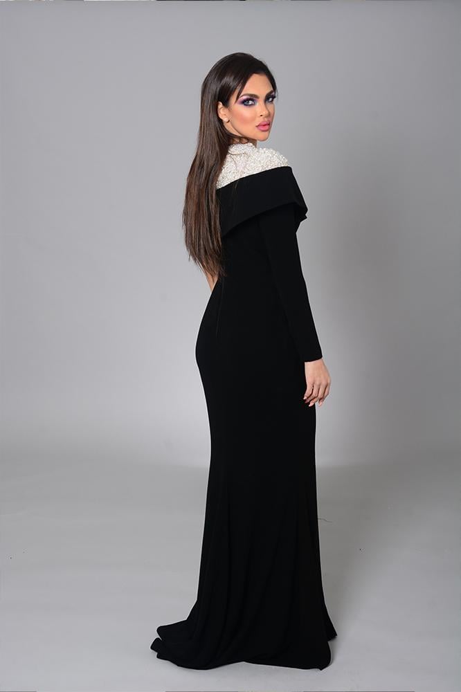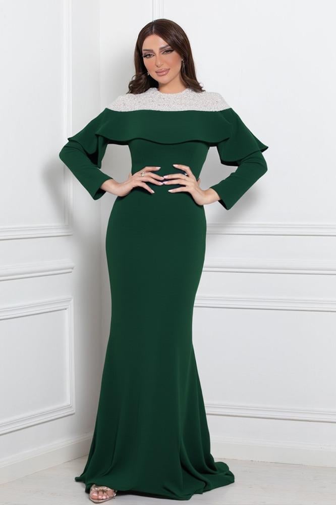 فستان كريب كم واحد مزين من الاكتاف بالكريستال والستراس