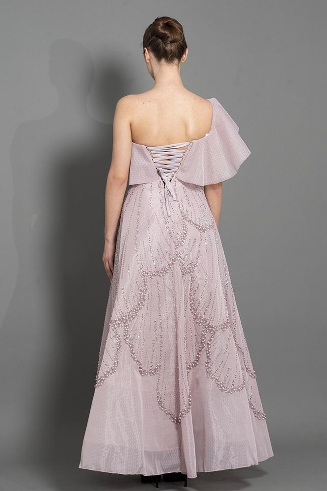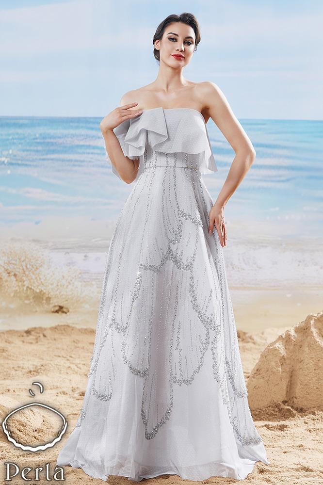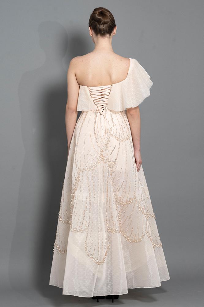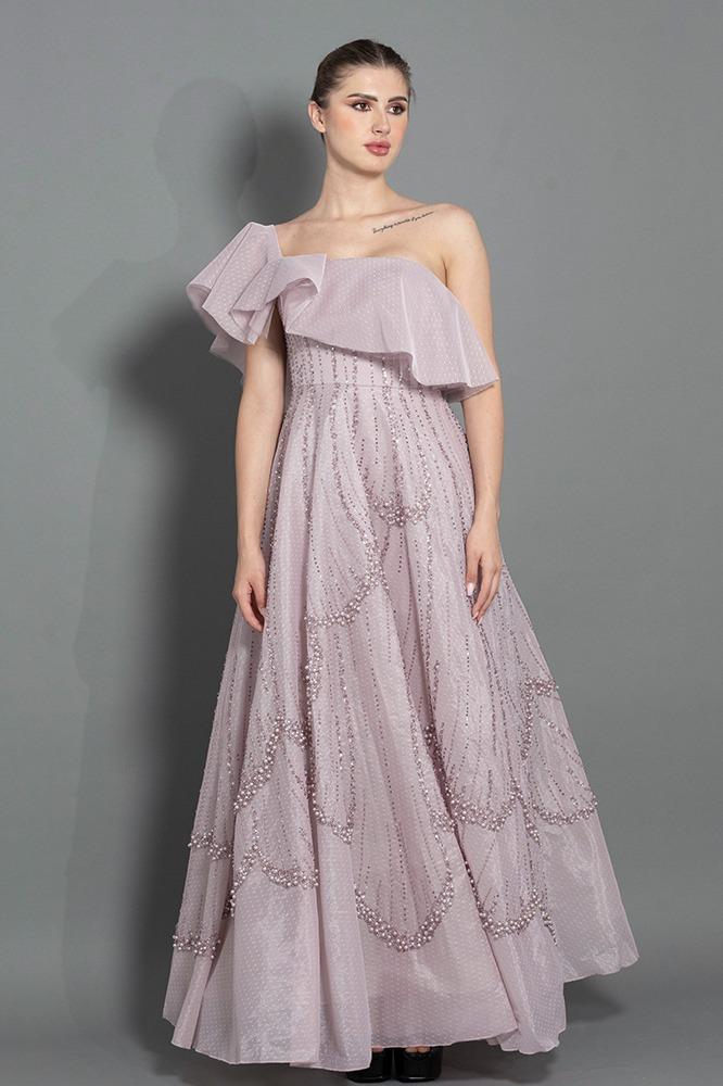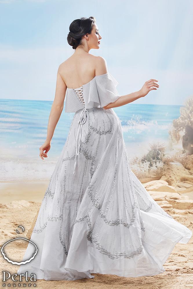 فستان كلوش بقصة الكتف المكشوفة مع طبقة كشكش تضيف لمسة أنثوية ، مع تطريز لامع بالكريستال و اللولو ، تصميم من بيرلا يجمع بين الأناقة والبساطة.