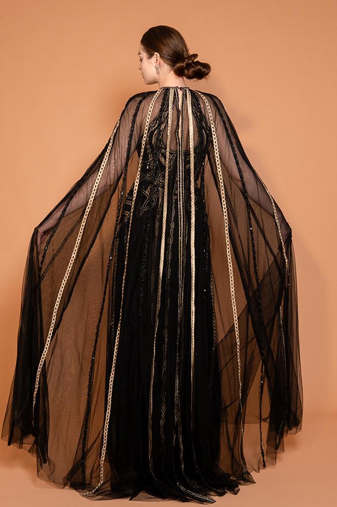 فستان من قماش التول الشفاف والمطرز بكريستالات فاخرة بقصة ضيّقة تُبرز القوام مع كاب طويل من التول المطرز ينسدل بانسيابية من الكتفين، ليمنح إطلالة ملكية