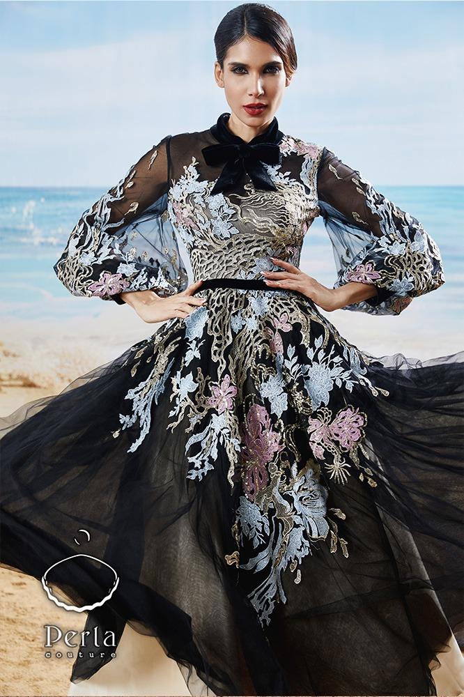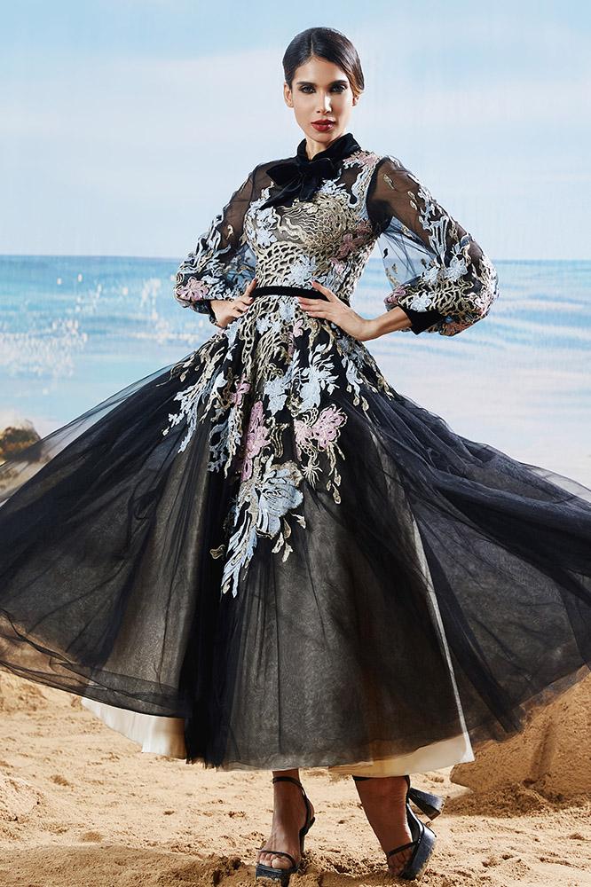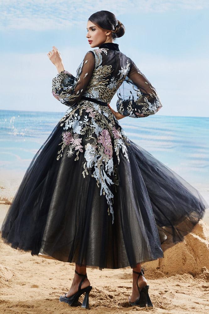 فستان ميدي بأكمام طويله بف مطرز بالورد مع فيونكه